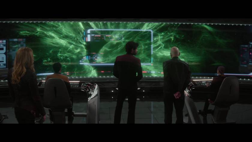 With a great big green tear right there in the middle of space, the heroes of Canton ride again. From two reinstated officers and admiral to a newly graduated cadet, and even an exonerated murderer (not OJ), the band is back together to solve the problem through means of poking the weird thing with a metaphorical stick. Well you would when it sends out a signal that is thousands of voices overlaid, basically chanting “Help us, Picard,” and requesting admission to the Federation. Or rather assimilation. Not exactly a cube, but there were enough hints in there to know what was coming through.