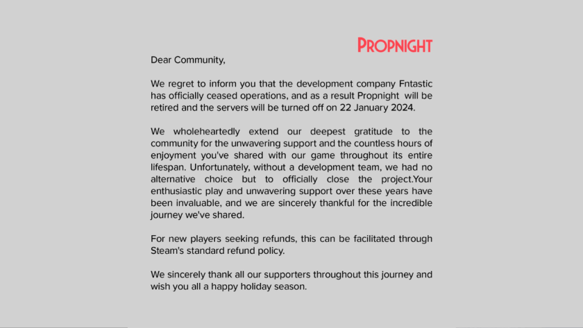 Ten days after the announcement of Fntastic’s closure, a post was made on X that the Propnight servers would be shut down on January 22nd, 2024 and the game would be pulled from Steam. While the Discord community that existed attempted to plead with the developers over the last month about handing the game over to the community, in a similar way to how Video Horror Society was, these pleas fell on deaf ears. Those very voices were also silenced since the developers seemingly took it upon themselves to delete the Propnight Discord server on the same day they shut the game’s servers down.